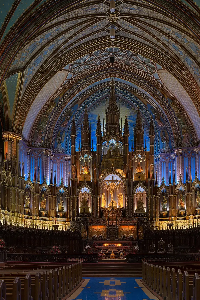 The interior is the reason to visit. Victor Bourgeau's redesign in the 1870s filled the sanctuary with carved walnut, gilt-leaf painted details, and the royal-blue ceiling studded with 24-karat gold stars that's become the building's signature image. The stained-glass windows — unusual because they depict scenes from Montréal's religious history rather than biblical ones — were installed 1929–31 by Francis Chigot of Limoges. The Casavant Frères organ has nearly 7,000 pipes; Celine Dion was married in this church in 1994.
